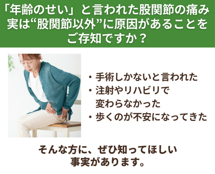 今ある股関節の痛みを「年齢のせい」「まだ我慢できる」と放置していると、
