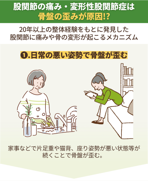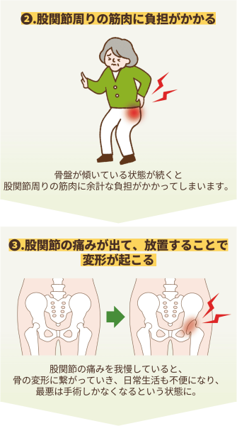 姿勢の崩れや左右のバランスの乱れにより、股関節に偏った負荷がかかり続けます。これが日常動作のたびに関節や軟骨を傷つけ、痛みの原因となります。