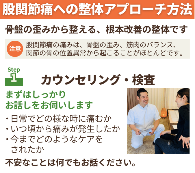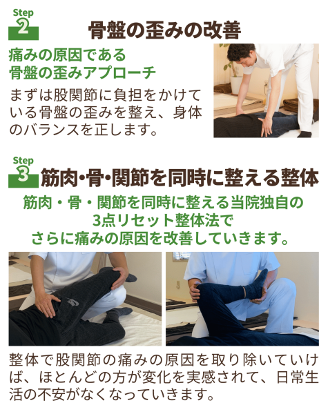 筋肉・骨格・関節の3方向から股関節痛の原因にアプローチする施術です。